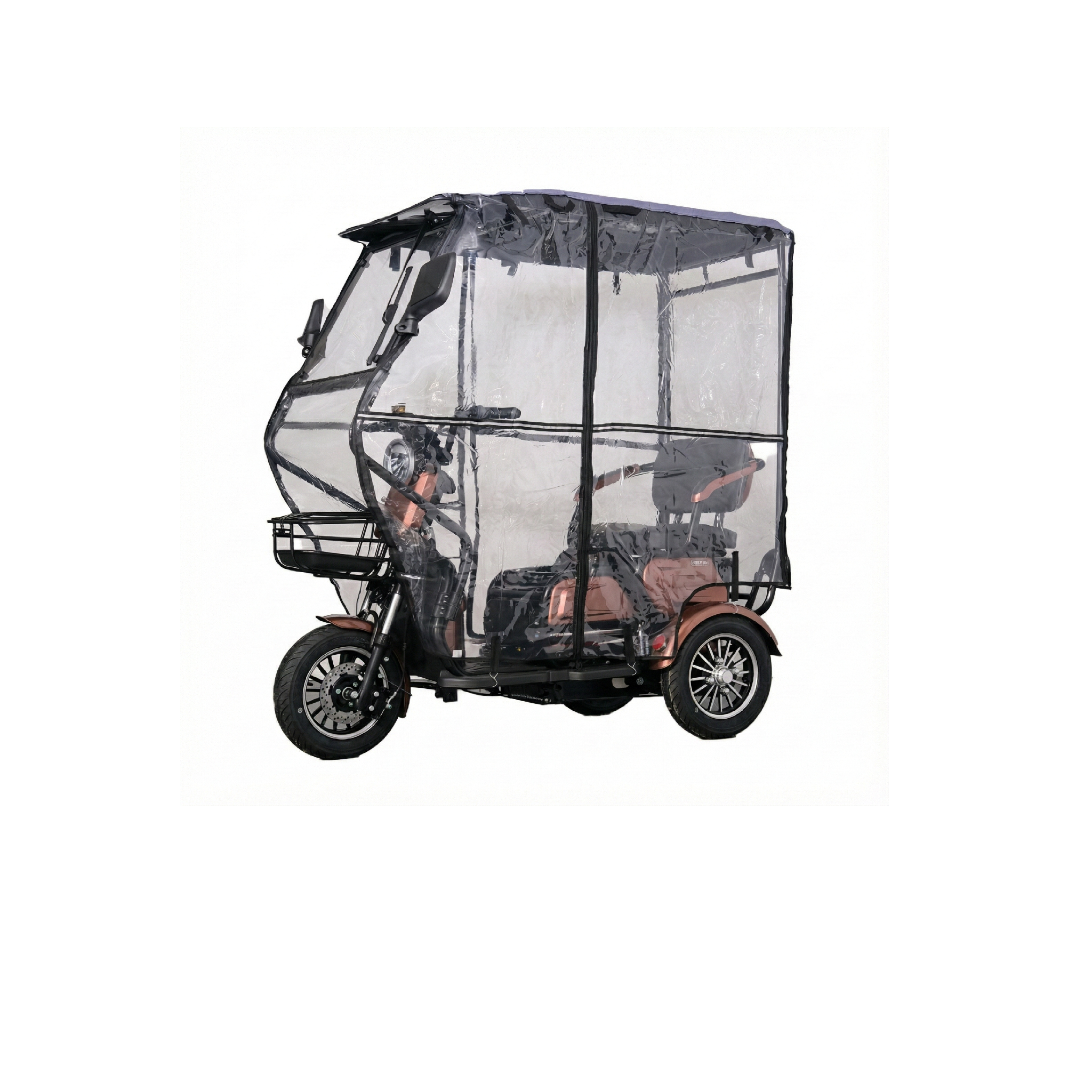 Stogas ir šoninė (360º) apsauga nuo vėjo, lietaus bei šalčio leis Jums mėgautis kelione bet kokiu oru. Aukštos kokybės PVC danga yra skaidri, neskyla ir netrūkinėja, tad turėsite gerą matomumą tiek lietingu, tiek vėjuotu oru. Montavimui Jums neprireiks jokių įrankių, kadangi apsauga lengvai prisitvirtina prie esamo rėmo.